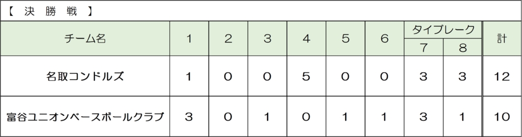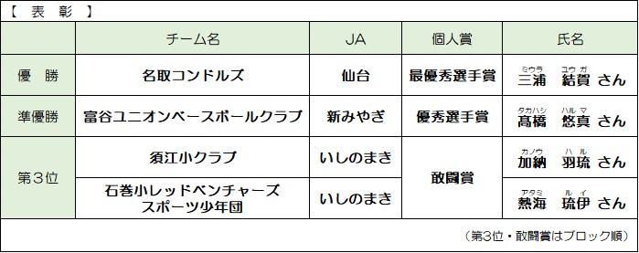 決勝戦はJA仙台代表の「名取コンドルズ」と新みやぎ代表の「富谷ユニオンベースボールクラブ」の対戦となり、6イニングで勝敗が決せず、特別ルール(タイブレーク方式)の末、「名取コンドルズ」が12対10で勝利し、宮城県大会初優勝を飾りました!